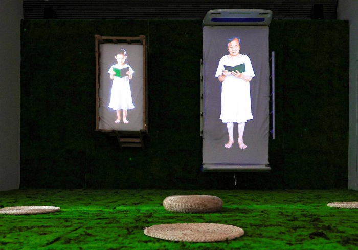 “看見美好”將藝術與公益共鳴的氛圍拉滿,設計師劉洋的《彼時此刻》成為連接紐帶,以日常物與多媒體融合,構建出一個意境美好的詩意空間,并借助AI技術創作了“一老一小”兩位女性的生命影像與聲音,讓人沉浸“彼時”與“此刻”的共存。